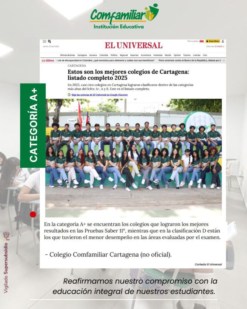El diario El Universal destaca a la Institución Educativa Comfamiliar como uno de los mejores colegios de Cartagena, alcanzando la categoría A+ gracias a los sobresalientes resultados en las Pruebas ICFES 2025.