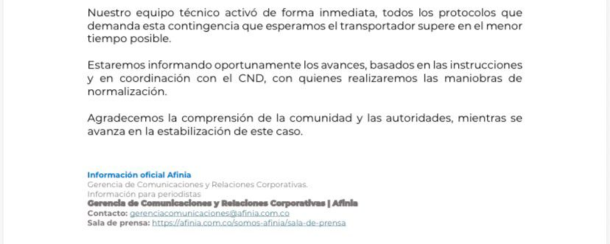 Nuestro equipo técnico activó de forma inmediata, todos los protocolos que demanda esta contingencia que esperamos el transportador supere en el menor tiempo posible.