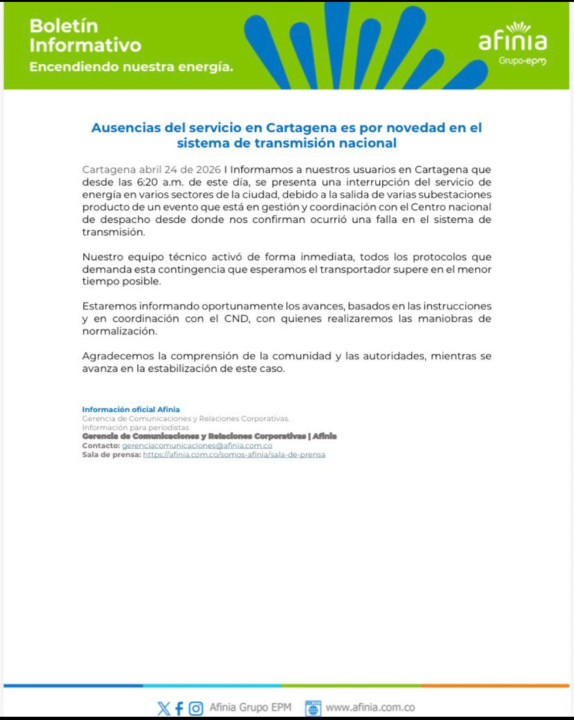 En un comunicado oficial, la empresa de servicios publicos Afinia explica la ausencia del servicio de energia en gran parte de la ciudad de Cartagena en la mañana del viernes 24 de abril: