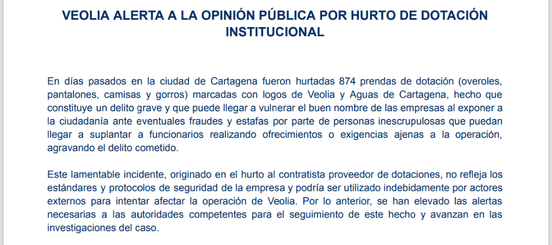 En días pasados en la ciudad de Cartagena fueron hurtadas 874 prendas de dotación (overoles, pantalones, camisas y gorros) marcadas con logos de Veolia y Aguas de Cartagena, hecho que constituye un delito grave y que puede llegar a vulnerar el buen nombre de las empresas al exponer a la ciudadanía ante eventuales fraudes y estafas por parte de personas inescrupulosas que puedan llegar a suplantar a funcionarios realizando ofrecimientos o exigencias ajenas a la operación, agravando el delito cometido.